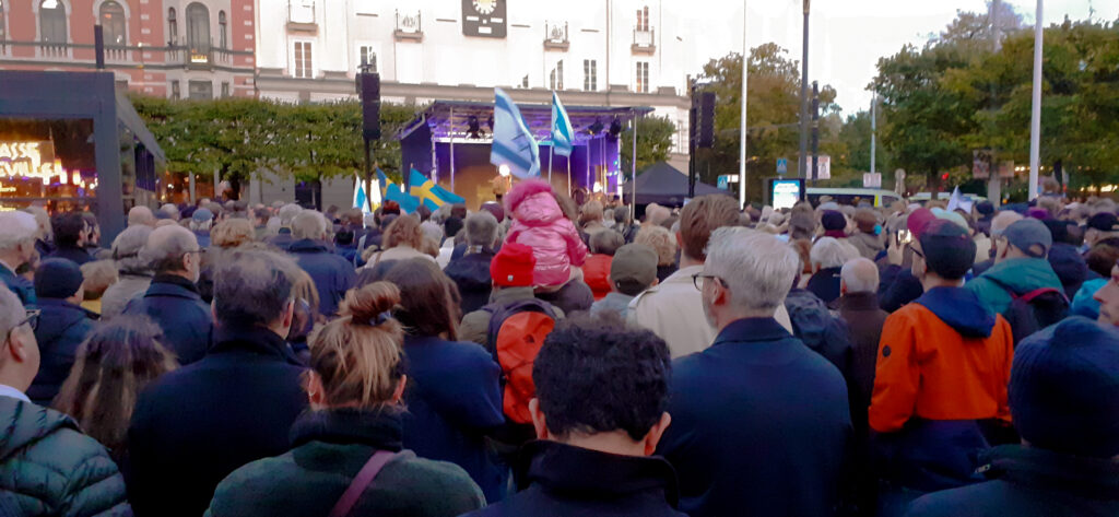 Kl 18 den 11/10 samlades en stor skara på Norrmalmstorg i Stockholm till en stark manifestation för Israel. Trots kort varsel hade ca 700 samlats denna blåsiga höstkväll för att visa Israel och det judiska folket stöd och solidaritet. Det var Vänskapsförbundet Sverige-Israel som arrangerat manifestationen och ordföranden Lars Adaktusson hälsade alla välkomna i ett kort tal där han uppmanade till fortsatt solidaritet med Israel i den katastrof som drabbat landet.